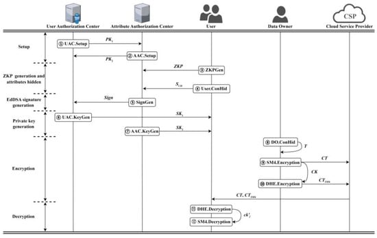 The system model consists of five main entities, which are the User Authorization Center (UAC), Attribute Authorization Center (AAC), Cloud Service Provider (CSP), Data Owner (DO), and User, as shown in Figure 5. The detailed definition is as follows: