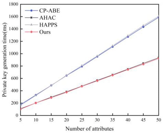 Private key generation time when the number of attributes increases [,,].