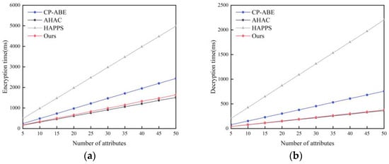 (a) Encryption time when the number of attributes increases; (b) Decryption time when the number of attributes increases [,,].