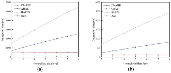 (a) Encryption time when the hierarchical data level increases; (b) Decryption time when the hierarchical data level increases [,,].
