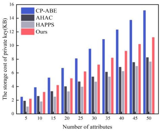 As the number of attributes increases, the storage cost of the private key of the four schemes is shown in Figure 10. Since AH-MAC-DHE hides user attributes, the storage overhead of AH-MAC-DHE is slightly higher than the schemes in [,]. At the number of attributes 50, the storage overhead grows by 2.9 KB and 3.5 KB compared to the schemes in [,], respectively. This part of the storage overhead growth is within acceptable limits.