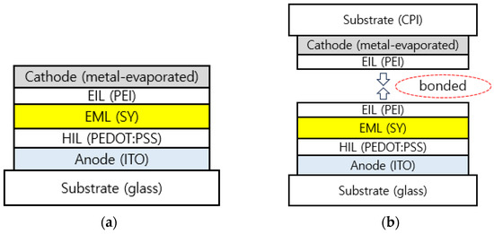 The bottom-emission organic light-emitting diode (BE-OLED) has a transparent anode fabricated on a glass substrate, and a relatively thick metal cathode, such as one made from aluminum. Light is emitted from the transparent anode direction. The most basic polymer OLEDs consist of a single organic layer as an emissive layer (EML). However, in order to improve device efficiency, multilayer OLEDs can be fabricated with functional layers such as a hole injection layer (HIL), a hole transport layer (HTL), an electron transport layer (ETL), and an electron injection layer (EIL). Figure 1 shows the OLED structure of this study, which consists of HIL, EML, and EIL between the anode and the cathode. In this paper, the device was manufactured with a simplified structure without the HTL and ETL. The reason for this is as follows. In this study, we bonded an anode substrate and a cathode substrate through an intermediate adhesive layer in air. The intermediate adhesive layer for this had to satisfy both physical adhesion and electrical conduction characteristics, but when optimizing this, if the number of layers was large, it was difficult to determine which layer had the discontinuous characteristics. Therefore, this paper focused on experiments to optimize the adhesive layer through a simplified structure.