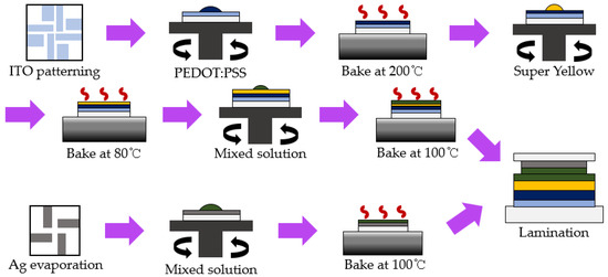 Recently, research attention has focused on developing white organic light-emitting diode (OLED) devices for use in flexible, rollable display devices and low-cost product lighting and the IoT. New challenges must be overcome before large-area flexible OLEDs using low-cost solution processes can replace the conventional expensive processes using evaporation and thin film encapsulation (TFE) in a vacuum. Many studies have evaluated solution processes to manufacture flexible OLEDs [1,2,3,4,5,6,7]. As a deposition technology for the solution process, roll-to-roll coating [1], slit coating [2], and spin coating [8] have attracted significant attention. On the other hand, lamination has garnered interest as an encapsulation technology, and many lamination methods have been proposed [9,10,11,12,13,14,15]. The lamination history began with Yang et al.’s report [9] in 2001 for double-substrate technology and Rogers et al.’s report [10] in 2004 for single-substrate technology. Soboyejo et al. examined the effects of pressure, layer thickness, and the substrate Young’s modulus on OLED fabrication [11]. A common approach to laminating OLEDs is using an Al-coated PET as a cathode substrate combined with the anode substrate. Wu et al. bonded the polymer layer surface of ITO/PEDOT:PSS and the other substrate using a D-sorbitol layer as a bonding layer, showing good mechanical and electrical contacts [12]. Tseng et al. reported a method for vacuum-free cathode deposition with a low work function using a PEG/Al bilayer on soft silicon rubber [13]. Duggal et al. reported OLEDs fabricated using a vacuum-free, direct lamination process of two PET substrates [14]. Naka et al. proposed a double-faced transparent OLED made using the lamination method [15]. Several studies have also been conducted on the interfacial properties of laminated polymer diodes in chemical and mechanical aspects [16,17,18]. Three technical issues must be solved so that the lamination method might be commercialized as a stable manufacturing technology for solution-processed OLEDs.