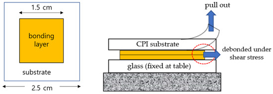 The top substrate used a colorless PI (CPI) film, and Al or Ag was thermally evaporated on CPI at a deposition rate of 5 Å/s, up to 1000 Å thickness. The PEI solution was then spin coated on top at 2000 RPM and heat treated at 100 °C to complete a top substrate. These two substrates were laminated using a hot roller at 120 °C at a speed of 0.85 m/min. The current density and luminance of the fabricated OLED were measured using an OLED parameter test system (M3000, McScience, Republic of Korea, Suwon, Republic of Korea). For the adhesion test, a shear test was conducted using a force measurement (DS2-200N, IMADA, Japan, Toyohashi), as shown in Figure 3, and the adhesion strength (kgf/cm2) was measured from the force divided by the bonding area.