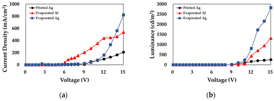 We manufactured OLED devices using a lamination method, as illustrated in Figure 2, in which a cathode electrode was manufactured using three different methods. In the case of Ag printing, we used P-100 (an ELCOAT product), which consists of flake-type Ag powder with a 1 µm average size, acrylic resin, and toluene. After printing, it was cured at 100 °C for 30 min. Figure 4a compares the electrical density, in which evaporated Ag showed the highest value.