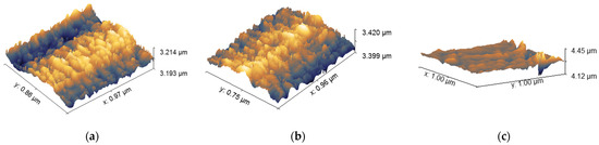 AFM images for the surface of the cathodes manufactured using different methods: (a) Al-evaporated; (b) Ag-evaporated; (c) Ag-printed.