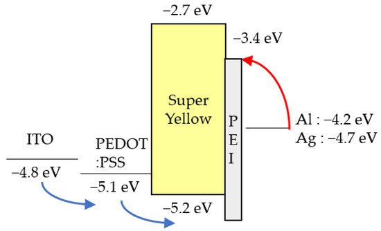 The adhesion layer requires good bonding strength and good electrical characteristics because it is an interlayer that plays a role in electrical transport between the anode and cathode. The electrical characteristics of the interlayer require good physical contact with the adjacent layers and a high current density through the layer itself. As mentioned in the introduction, previous studies mainly used a PEDOT:PSS layer as an adhesion layer. The PEDOT:PSS layer is not sticky enough, so they mixed considerable amounts of adhesive additives into PEDOT:PSS, such as D-sorbitol, which resulted in some loss of electrical characteristics. In this study, the adhesion layer was selected as follows. The feasibility of each interfacial layer (HIL, EML, and EIL) as an adhesion layer for lamination was tested. In this experiment, PEDOT:PSS, SY, and PEI were designed to have a thickness of 40, 80, and 10 nm, respectively. PEDOT:PSS was too dilute to achieve bonding characteristics, and SY was not sticky. In comparison, PEI was highly viscous and showed good adhesion characteristics; hence, it was chosen as an adhesion layer for the lamination in this study. On the other hand, the 10 nm thickness was too thin to maintain stable adhesion, so the thickness was changed by increasing the PEI wt%. The thickness increased as the PEI content was increased, and better adhesion characteristics were obtained, but the electrical current density decreased abruptly, as shown in Figure 6. This means the two characteristics cannot be obtained concomitantly using only a PEI layer. In addition, we should consider the electrical characteristics via the adhesion layer. Figure 7 provides an energy diagram for each layer of the OLED device in this study. Considering the anode side, the differences in work function between ITO, PEDOT:PSS, and EML are small and do not impede hole transport. On the other hand, considering the cathode side, there is a large difference between the Super Yellow and Al cathode. The energy level of the lowest unoccupied molecular orbital of SY is approximately −2.7 eV, and the work functions of Al and Ag are −4.2 and −4.6 eV, respectively. Hence, there is a large energy barrier for electron injection. As mentioned in the introductory section, many researchers have used an additional layer on the cathode to reduce the energy barrier at the interface [35,36,37,38]. Frey et al. deposited a PEG film on the anode or cathode and reported improved characteristics [38]. They suggested that dipoles are formed in the solution, which assist in electron injection; but this technology is very sensitive regarding the overall electron injection characteristics, as they are added in the form of a film on the cathode. Koch et al. examined the influence of preparation conditions of PEI films to reduce the work function of electrode materials [46]. They obtained a homogenous PEI film on ZnO by annealing in a vacuum, which produced an improved electron injection due to the lowered work function at the interface. On the other hand, this enhancement was only possible with vacuum annealing. Atmospheric annealing led to the significant diffusion of PEI into the adjacent film, resulting in poor surface coverage with PEI and residual solvent. The multilayered structure was unstable, and the materials were easily mixed at the interface, as is often the case in the solution process. Therefore, this study attempted to mix the solutions to enhance the electron injection characteristics. The mixing of PEG into the PEI solution was modified. Before manufacturing the device, this study investigated the adhesion characteristic of PEG, as shown in Figure 8. PEG was added to 0.01 wt% PEI, which revealed enhanced adhesion characteristics.