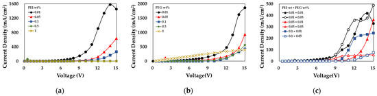 Comparison of the electrical characteristics of the adhesive interlayers: (a) PEI only; (b) PEG only; (c) PEI and PEG mixed.