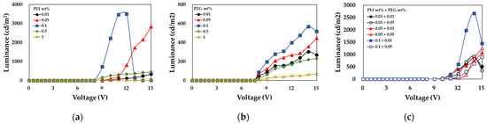Comparison of the luminous characteristics of the adhesive interlayers: (a) PEI only; (b) PEG only; (c) PEI and PEG mixed.