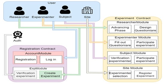 The architecture of BlindBox is illustrated in Figure 1. The blue sections represent users, including researchers, experimenters, subjects, and sites. The registration contract consists of two main modules: the account module and the experiment module. The account module is responsible for handling user registration and login. Users within the system must possess an Ethereum address to represent their identity and access the contract. The experiment module serves two primary functions: verification of experiments by supervisory entities, and the creation of new experiments by researchers. The experiment contract incorporates modules for different user roles. The researcher module provides researchers with information about the current progress of the investigations. It offers interfaces for data querying, editing, and management based on the varying stages of the experiments. This includes experiment details, participant recruitment timelines, and survey locking. Researchers can design survey content using this module and add, delete, modify, and query surveys. The experimenter module empowers experimenters with permission to authenticate and participate in experiments. This module facilitates tasks such as matching experimental materials with subjects and submitting subject survey responses. The subject module provides subjects with features to authenticate the experimenters’ identities, match experimental materials, and engage in relevant experiment-related functions. The site module enables experimental sites to register experiments and request participation by experimenters.