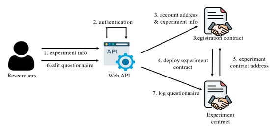 Experiment publication is illustrated in Figure 2. Researchers input details such as the experiment name, content, duration, and number of subjects. These details are uploaded to the registration contract through the system. The registration contract stores the experiment information on the blockchain for future retrieval and reference. Subsequently, the registration contract generates a corresponding experimental contract and records the address of the experimental contract on the blockchain. Researchers then utilize the experimental contract to design the survey questionnaire. Survey questionnaires can include multiple-choice and open-ended questions, but only multiple-choice questions can be processed by smart contracts. Content from open-ended questions is anonymized and stored on the IOTA platform.