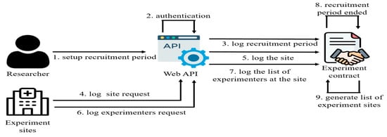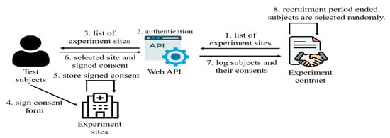 The recruitment process on this platform involves two distinct phases: The first phase centers on enlisting suitable experimental sites. As depicted in Figure 4, these sites could include medical facilities like hospitals or clinics. Researchers initiate this stage by defining a recruitment timeline in the experimental contract. They actively invite hospitals or clinics to participate in the experiment. Interested sites wishing to join the study must formally register within the system, providing details about the site and responsible experimental personnel. After thoroughly verifying that the potential site meets the stipulated requirements, including appropriate facilities and qualified medical staff, the site is designated as a prospective location. Following the conclusion of the recruitment period, the experimental contract compiles a roster of eligible experimental sites. The final selection of the experimental site is accomplished through an automated randomization process conducted within the experimental contract.