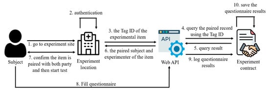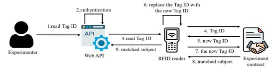When the experimental items are delivered to the experimental site, the experimenter must place the experimental items in the black box and then randomly extract the experimental items and request the web API (/Scanitem) to scan the RFID tag of the experimental items. After the web API (/Scanitem) scans and reads the Tag ID, it will send the Tag ID to the experimental contract. The experimental contract will generate a new RFID Tag ID, record the corresponding relationship between the old and new Tag IDs in the experimental contract, and then return the new RFID Tag ID. The web API (/Scanitem) then returns the new Tag ID from the experimental contract, copies it to the RFID tag, and then sends it back to the user. After the item is rescanned, the experimental contract will automatically match the experimental items with the subjects and record them. When the subject comes to the hospital for testing and scans the experimental items, the new Tag ID will be used to query and verify the experimental contract with the subject and experimenter matched with this Tag ID. Since no one can read the correspondence between the old and new Tag IDs, the subjects cannot know whether they are in the experimental group or the control group and, therefore, cannot collude with the researchers to deliberately produce questionnaire results that are beneficial to the pharmaceutical company.