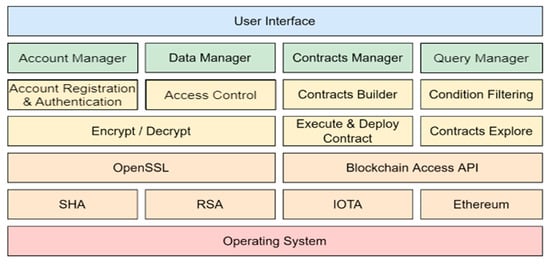 The double-blind trial platform based on a distributed ledger proposed in this study has been successfully implemented. The software stack is illustrated in Figure 10. The uppermost blue section represents the user interface layer, which provides web interfaces for researchers, experimenters, and participants. The green section represents the management layer.
