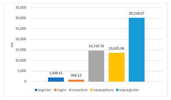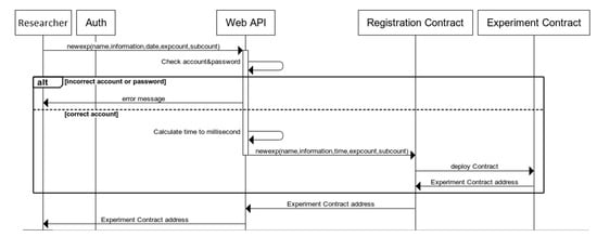 The experiment release process is shown in Figure 11. The process is as follows: (1) The researcher enters the experiment name, experiment information, experiment date, number of experimenters, and number of subjects into the web API (/NewExp) and enters the account password through Basic Auth. (2) The web API (/NewExp) checks whether the account password matches the information on the blockchain. An error message will be returned to the researcher if the account password is incorrect. (3) The web API (/NewExp) converts the unit of the input date into milliseconds because the time on the smart contract is based on the timestamp of the block, and the unit is milliseconds. (4) The web API (/NewExp) enters the above information into the registration contract. (5) The contract is registered to deploy a new experimental contract, the account address of the experimental contract is recorded, and it is returned to the web API (/NewExp). (6) The web API(/NewExp) then returns the address of the experimental contract to the researcher.