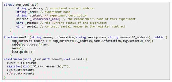 Figure 12 shows the data structure and codes for publishing the experimental contract, which are used to record and track experimental research contracts and associate them with specific addresses and other information. The serial number is used to retrieve the experimental contract in the registered contract. The experimental contract’s constructor records the number of experimenters, the number of subjects, and the experiment time.