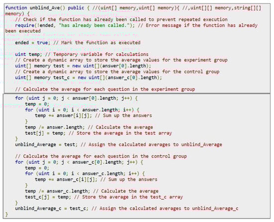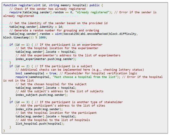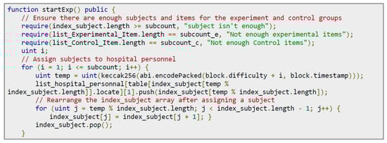 On the other hand, the researcher triggers the experimental contract to randomly select subjects, store them in the experimental contract, and notify the selected subjects to go to the hospital of their choice for testing. Figure 15 shows the codes for pairing subjects with experimenters. The steps are as follows: (1) Check the number: Ensure that the number of subjects is sufficient; that is, the length of the index_subject array must be at least equal to the subcount. Make sure that the number of items in the experimental group is consistent with the expected number; that is, the length of list_Experimental_Item must be equal to subcount_e. Make sure that the number of items in the control group also meets the requirements; that is, the length of list_Control_Item must be equal to subcount_c. (2) Assign subjects to experimenters in the hospital: Through a for-loop, subjects are randomly assigned to experimenters in the hospital. Use keccak256 to generate a pseudorandom number and select the subject from the index_subject array based on this number. After selection, update the index_subject array to remove the assigned subjects.