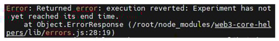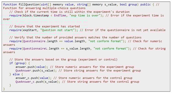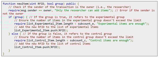 When the experiment begins, the researchers must send the experimental products to each experimental location. Before sending the items out, the experimental item’s RFID tag must be scanned and recorded in the experimental contract. The program code is shown in Figure 14. The steps are as follows: (1) Permission check: Confirm that the owner of the contract (i.e., the researcher) initiated this function call, to ensure that only authorized personnel can add items. (2) Group judgment: Determine whether the item is added to the experimental or control group based on the passed group parameter. (3) Quantity check: Check whether the quantity of items in the selected group has reached the predetermined quantity limit. (4) Add items: Add the RFID tag of the item to the item list of the corresponding group.
