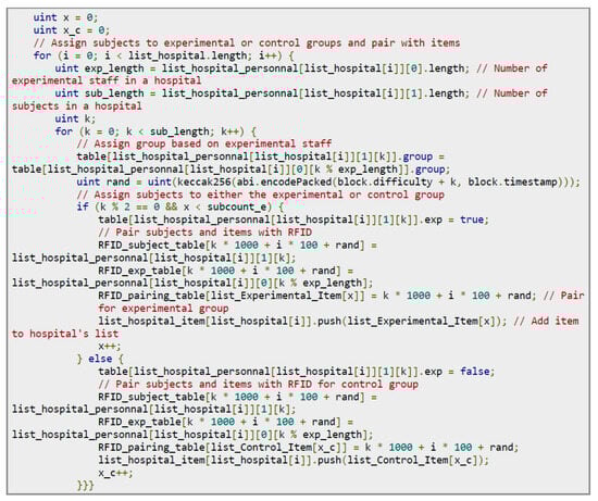 Figure 16 shows the program code for matching subjects with experimental items. The process assigns subjects by a for-loop to the experimental or control group according to the number of subjects and the number of experimenters in the hospital. If the subject is assigned to the experimental group, the exp is set as true, and the subject’s RFID pairing is performed. If the subject is assigned to the control group, the exp is set as false, and the RFID pairing of the experimental item is performed. The final step is to create an RFID pairing record for each subject and experimental item.