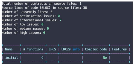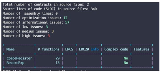 Therefore, for security analysis, we scanned the Solidity codes of the proposed platform using Slither [], which is a smart contract static analyzer. Figure 26 shows that the registration contract has no program vulnerability.