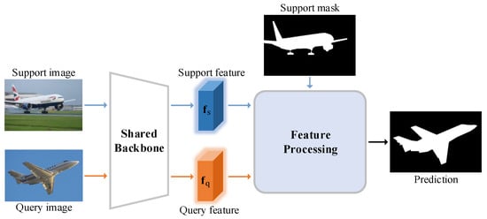 The framework of common few-shot learning methods. The support image and query image sample pairs are input into the backbone network, and the respective feature maps are generated. In feature processing, support feature performs a MAP operation with a support mask to generate the support prototype. The query feature will segment the query image and generate the prediction map under the guidance of the support prototype.