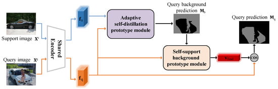 The meta-learning [,,,] and the metric-learning [,,] are the two most important paradigms in FSS. Meta-learning necessitates the model to posses the capability of “learning to learn”. The metric-learning transforms a classifier guided by parameters into a classifier guided by distance. A model with a strong distance mapping ability can serve as a viable solution to the challenges of FSS. The current FSS methods combine meta-learning and metric-learning to construct reasonable segmentation models, as shown in Figure 1. The support image and query image sample pairs are input into the backbone network, the respective feature maps are generated and the query image is segmented under the guidance of the support mask. These models [,,,] enhance their performance by accumulating experience through multiple learning phases and leveraging this experience to classify the test set through self-learning on the training set. Although these models combining the two paradigms can segment the image, they have low accuracy and slow segmentation efficiency in the segmentation effect. Stable and accurate segmentation of images is very important in the fields of intelligent medical treatment, automatic driving, national defense and so on. A small deviation can lead to unpredictable consequences. Therefore, how to improve the accuracy and speed of model segmentation is the important and difficult problem of current research. To enhance the accuracy of our model, we employ self-adaptation and self-support strategies.