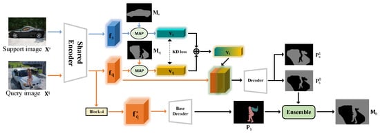 where and represent the support and query feature map obtained from the support and query image through the shared network CNN, respectively. and denote the support mask and query mask, respectively. represents the masked GAP operation. The mask M and the feature map have the same height and width. and are the outputs of softmax operation on and . On the basis of knowledge distillation, we use the Kullback Leibler divergence to calculate loss to adjust and optimize the support prototype. represents the loss of the support and teacher prototype in the knowledge distillation process:
