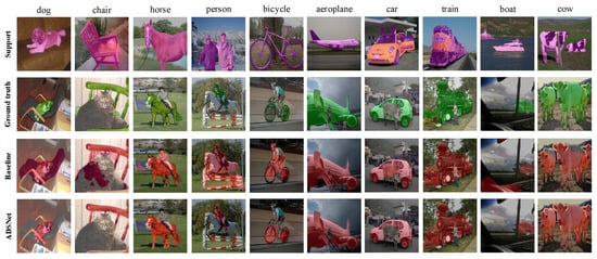 Qualitative results. To analyze and understand the performance of the proposed model more directly, as shown in Figure 6, we present partial results on the PASCAL- dataset under the 5-shot setting. Firstly, in the first eight columns, the query images all contain base objects, indicating that the model has a clear suppression effect on base class objects and achieves more accurate segmentation of the targets. For example, in the seventh column, even with occlusion from base class objects, our model performs well in segmenting the car. But the baseline model misclassified a cow as a car. Secondly, there may be significant intra-class differences between the support images and query images. For instance, in the ninth column, the boat in the query image is in a highly complex environment, and the baseline model is greatly affected, while our model still demonstrates good generalization ability.