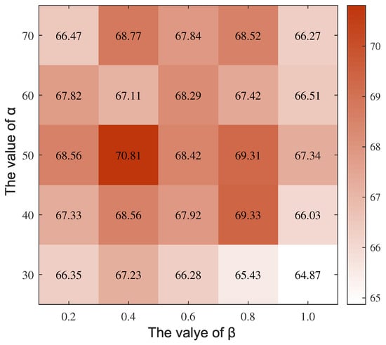 Ablation experiments with the values of the two loss function coefficients and , and the color shades represent the performance of the model.