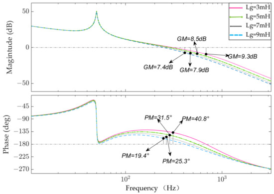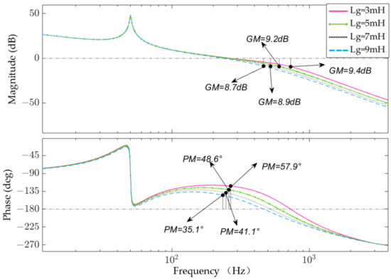 According to Equation (5), in order to verify the stability of the system under different grid-side line impedances, the open-loop frequency response Bode diagram of the system is plotted, as shown in Figure 4. It can be seen from the figure that as the grid line impedance gradually increases, the phase margin (PM) of the system decreases while the gain margin (GM) changes less. When Lg = 9 mH, the system phase margin is only 19.4°, which does not meet the engineering application requirements. In addition, the passive component R increases the power loss in the system, so optimization of this control strategy is necessary.