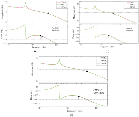 Figure 8 reveals that the system’s stability can be maintained even when the parameters of the LCL filter components change, and both the phase margin and gain margin have good margins. These results demonstrate that the proposed hybrid active damping system with feedforward compensation exhibits robust stability.