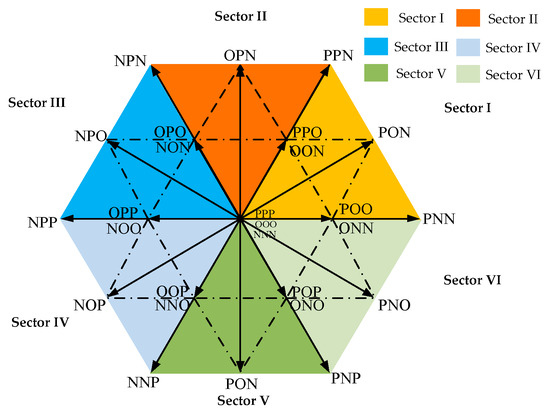 Figure 9 illustrates the classification of vectors into 3 zero vectors, 12 small vectors, 6 medium vectors, and 6 large vectors based on their length. The zero vectors (PPP, NNN, OOO) and large vectors (PNN, PPN, NPN, NPP, NNP, PNN) do not affect the neutral-point potential, while the medium and small vectors can produce fluctuations in the neutral-point potential. Table 1 shows the midpoint current generated by the medium and small vectors.