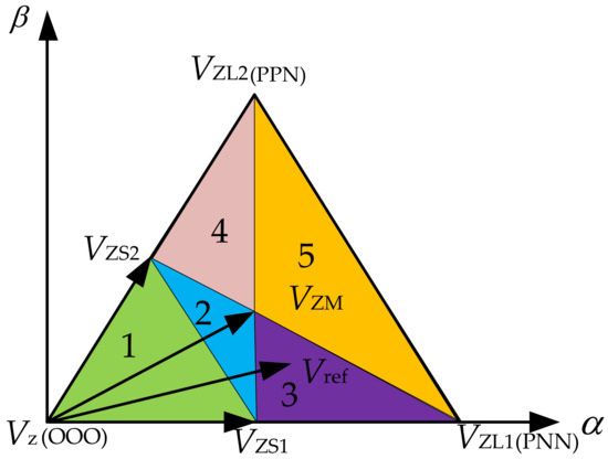 VSVPWM technique utilizes virtual vectors that are synthesized from the combinations of small and medium vectors to achieve neutral-point potential balancing. In this context, VO(OOO) is a basic zero vector, VS1(ONN), VS1(POO), VS2(PPO), and VS2(OON) are two pairs of redundant basic small vectors, VM(PON) represent a basic middle vector, VL1(PNN) and VL2(PPN) represent a basic large vector. VZ denotes the virtual zero vector, VZS1 and VZS2 represent the virtual small vectors, VZM denotes the virtual medium vector, and VZL1 and VZL2 represent the virtual large vectors. Specifically, the virtual small vector is composed of two pairs of redundant basic small vectors. By controlling the action time of the two redundant vectors, the average current flowing into the midpoint potential of the bus is 0, which avoids the influence on the midpoint potential. The action time of the three space voltage vectors in the virtual is the same. Due to the three-phase three-wire structure, the current flowing into the midpoint potential of the bus is ia + ib + ic = 0 to avoid the midpoint potential fluctuation; the action of the virtual large vector will not affect the midpoint potential; VSVPWM achieves the balance of the midpoint potential by controlling that the average value of the midpoint potential current of the inflow and outflow bus bar in each modulation period is zero.