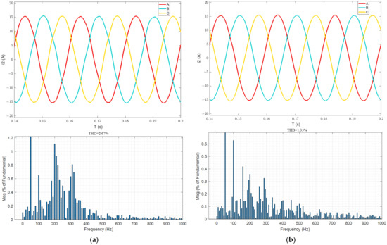 The comparison between Figure 16 and Figure 17 shows that the experimental waveform confirms the effectiveness of the proposed control strategy. Figure 16 shows that in the absence of grid impedance, the two control strategies show stable operation and low harmonics, indicating that they meet the requirements of grid connection under the condition of a strong power grid. Figure 17a shows that when Lg = 4.2 mH and the hybrid damping strategy of Ref. [24] are adopted, the harmonic component of the grid current increases. However, the improved control strategy, as shown in Figure 17b, effectively reduces the harmonic component by 1.1% compared with the previous control system. The improved control strategy significantly improves the current quality of the power grid, thus expanding the scope of application of the weak power grid, enhancing the stability of the system, and improving the ability to suppress harmonics.