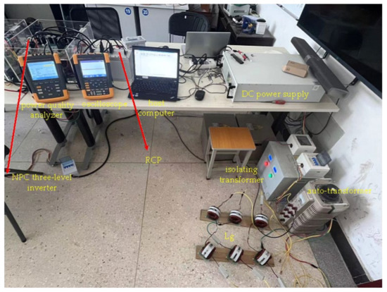The experimental setup comprises a programmable DC power supply from German EA company (EA-PSI 9500-60, Viersen, Germany), an NPC three-level inverter (YXPHM-TP310b-I) produced by Nanjing Yanxu Electric Co. Ltd. in Nanjing, China with signal detection and drive systems, an LCL filter, a grid-connected transformer, a rapid controller prototyping (RCP) of YXSPACE-10 produced by Nanjing Yanxu Electric Co. Ltd. in China, and a host computer. Prominent testing instruments include a Fluke 190-204S oscilloscope and a Fluke 435 II power quality analyzer produced by Fluke Corporation in Everett, WA, USA. Simulation analysis is carried out by constructing system models and controllers in the MATLAB/Simulink (2021a) environment on the host computer. The real-time control of the inverter is achieved using the RCP prototype controller, based on the results of the simulation analysis, to verify the practical effectiveness of the proposed algorithm. In order to simulate the grid impedance (Lg), a specific value of inductance is connected in series on the grid side.