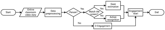 We can obtain the learner’s class video data through the built-in camera of the online learner’s learning device or peripheral camera (placed in the middle, above the computer screen). Our proposed method can evaluate classroom learning engagement by analyzing multimodal visual information such as gazes, facial expressions, and classroom behavior during the learning process. We apply a hierarchical strategy in our evaluation method: firstly, we perform person detection and identity recognition on the input data. If there is no person or the detected face is not the learner himself, it is judged as not engaged; secondly, we estimate the learner’s gazes. The yaw and pitch angles obtained are calculated through a function. If the function value is greater than the set threshold, it is considered as facing the screen; otherwise, it is not facing the screen. The learner facing the screen is a prerequisite for paying attention, and further through facial expression recognition, it can be judged whether the learner is engaged in learning; when the learner is not facing the screen, it may not necessarily mean that they are not engaged in learning. For example, writing and reading are expressions of engagement in learning. Therefore, our method recognizes the learner’s actions when they are not facing the screen to judge whether they are engaged in learning. The overall research plan is shown in Figure 1.