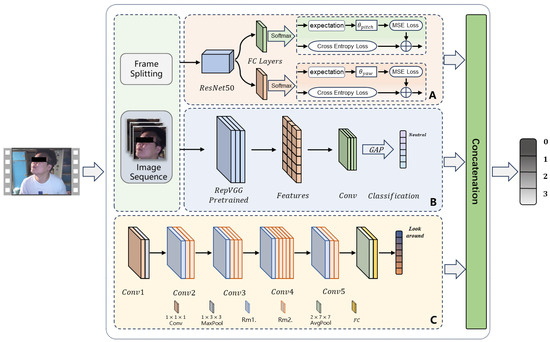 Model of the hierarchical framework for online classroom student engagement. (A) The gaze estimation model. (B) The proposed facial expression recognition model. (C) The proposed action recognition model.