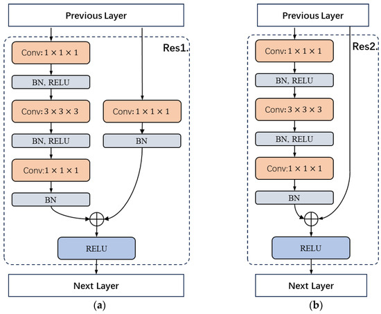 Two detailed submodule of Inflated ResNet. (a) Detailed structure of the Res1. submodule. (b) Detailed structure of the Res2. submodule.