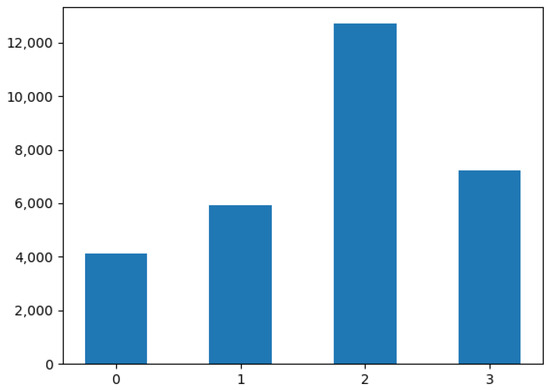 The single class session lasts for 100 min. Each student’s online learning video was preprocessed, removing the duration data outside of class time, and the original videos were trimmed. Every 10 s was considered a segment for engagement analysis, and ultimately 30,000 video segments were separated out. We invited four experts to annotate the data, which included the teacher who taught the class when the data were collected and three teachers who taught the same course. Each segment of the video was annotated by two teachers. If the two teachers disagreed about the annotation of the same video segment, a third teacher would provide additional marking. If all four teachers’ annotation results were different, they would collectively annotate it. Each dataset’s labels were marked in the format of “expression–action–engagement level”. The engagement level refers to the classification method of Gupta et al. [35] for data annotation. After the data are labeled, seven common classroom actions are statistically obtained, including listening to lectures, writing, reading, eating, looking around, sleeping, playing with mobile phones, etc., along with six expressions, including surprise, confusion, calm, happy, tired, bored, etc., to complete the construction of the dataset. Figure 5 shows the distribution of the number of samples at four engagement levels in the dataset. Level 0 indicates very low learner engagement, while level 3 means the learner’s engagement is very high.