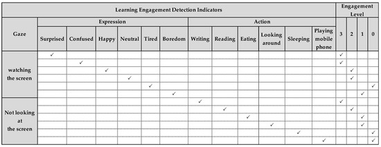 Considering the strong subjectivity in rating students’ engagement, different experts may have significant discrepancies in the engagement scores given to the same student behavior. Therefore, in light of the content above, we summarize the approach of evaluating students’ learning participation by rating the engagement level of students in online classrooms. We reference [35] and make four levels of engagement rating, from level 0 to level 4 in increasing order. When the classroom is empty, it is assumed that the student has no engagement. Other rating methods for engagement detection indicators are shown in Figure 10.