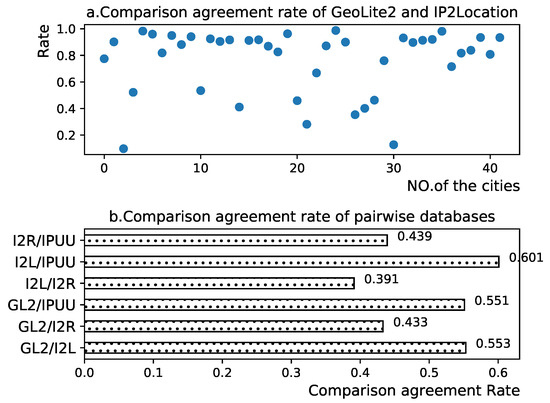Figure 1b provides a schematic of the comparative agreement rates obtained from pairwise comparisons of the four experimental databases. We observed that the comparative agreement rates between different IP geolocation databases vary, with overall rates being low. Among the 42 selected cities, the two databases exhibiting the highest similarity are IPUU and IP2LocationLite, with an average comparative agreement rate of only 60.1%. Conversely, IP2LocationLite and IP2Region, which display the lowest similarity, have an average comparative agreement rate of a mere 39.1%. This suggests that while most cities have location-aligned IP addresses provided by multiple IP geolocation repositories, this high degree of similarity does not extend to all cities. In a few cities, there is significant conflict between the positioning information provided by different IP geolocation repositories.