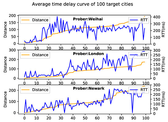 RTT–distance curve graph of 100 cities.
