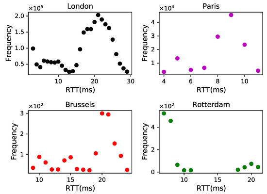 To verify the reliability of the method of the localized delay distributions’ similarity proposed by F Zhao et al., we conducted delay probing from the London node for IP addresses localized in four cities, namely London, Paris, Brussels, and Rotterdam. Subsequently, we tallied the delay frequency of different RTT messages located in the same city according to their frequency of occurrence. By considering the delay frequency as a characteristic of RTTs, we plotted the frequency–delay graph as depicted in Figure 4.