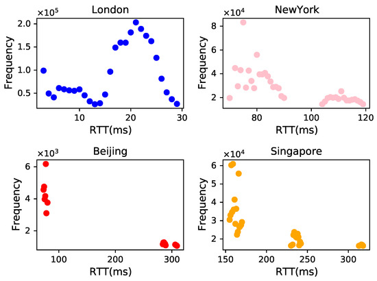Our objective is to discern the delay characteristics of cities, yet accurately obtaining the delay information of cities and determining their delay distribution model pose significant challenges. Figure 7 illustrates our frequency–delay graph from the London node for four cities: London, New York, Beijing, and Singapore. In contrast to the three cities closer to London in Figure 4 (Paris, Brussels, and Rotterdam), the three cities further from the London node in Figure 7 (New York, Beijing, and Singapore) exhibit a large RTT mode and a broad distribution of RTTs, as well as the phenomenon of RTT outlier nodes and RTT clusters. Their delay distributions are so irregular that they cannot be adequately represented by any mathematical model.