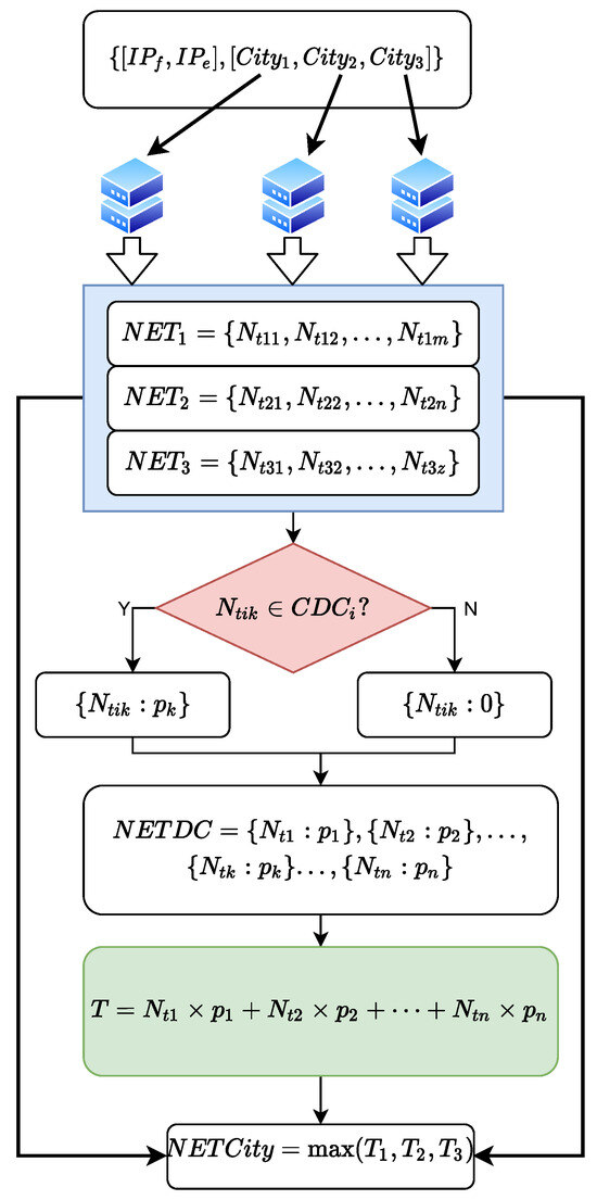 To effectively obtain trusted IP addresses located in the target city, we propose a dynamic comparison mechanism based on multiple databases. As observed in Section 3.1, different IP geolocation databases often contain many identical IP addresses within the same city. These location-consistent IP addresses are more trustworthy than other IP addresses with location conflicts. Consequently, we treat all IP addresses that are locationally identical across multiple IP geolocation databases as trusted IPs. These are then divided by city to obtain a set of trusted IP addresses for a city, referred to as the set of city IPs (IPsame). If an IP address lacks city information in a certain database, then that database is not involved in the comparison. This dynamic comparison mechanism based on multiple databases maximizes the number of trusted IP addresses.