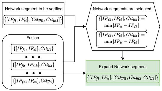 To enhance the credibility of the candidate cities of a network segment, we propose a method to extend the candidate cities of a network segment. Yong Gan et al. suggested that the geolocation of an IP address can be determined by a sequence of neighboring IPs [33]. Therefore, we propose to extend the list of candidate cities of a network segment based on the nearest neighbor matching mechanism of a network segment. Specifically, we compare the network segment to be verified with the network segments in the Fusion database, identify the network segment from the Fusion database that is the closest neighbor to the network segment to be verified, and add the localized city of that segment into the list of candidate cities for the network segment to be determined. Figure 11 provides a schematic diagram of the candidate city expansion method based on the nearest neighbor network segment matching mechanism.