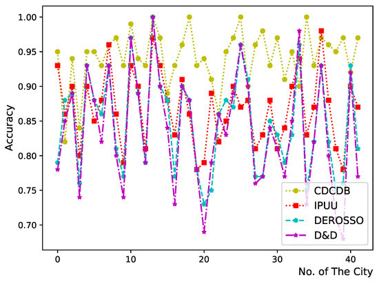 We also evaluated the geolocation accuracy of the DEROSSO model proposed by H Li et al. [18] and the D&D model proposed by X Bo et al. [19], as well as IPUU, in 42 experimental cities. As depicted in Figure 12, we find that the overall accuracy of both DEROSSO and D&D is lower compared to CDCDB, indicating that our proposed evaluation method effectively enhances the accuracy of the reference database. We also observe that the accuracy curves of DEROSSO and D&D models follow almost the same trend as that of IPUU, and do not demonstrate any superiority over the original IP geolocation database IPUU. This suggests that the reference databases constructed by DEROSSO and D&D models are highly dependent on the IP geolocation database IPUU and do not significantly improve geolocation accuracy. Conversely, the overall accuracy of CDCDB is significantly improved compared to that of IPUU, indicating that our constructed reference database effectively improves city-level geolocalization results of IP addresses and is less dependent on the original IP geolocation database.
