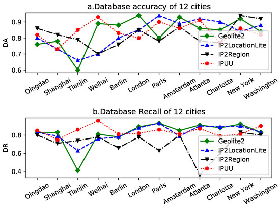 In this study, we selected 12 cities across China, Europe, and the United States to evaluate the city-specific performance of the IP geolocation repository. Figure 13 presents a schematic representation of the database accuracy and database recall results for four experimental IP geolocation libraries across these 12 cities.