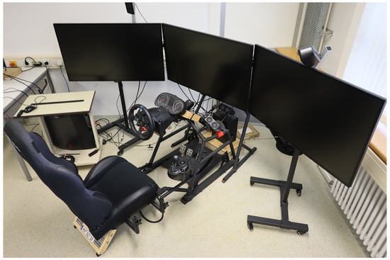 The driving assessment was conducted using the City Car Driving—Car Driving Simulator software V1.5, from Forward Development, https://citycardriving.com/ (accessed on 18 December 2022), which is known for its implementation of advanced car physics that provides a high level of realism. The City Car Driving simulator software V1.5 was purchased on their online store. Furthermore, the simulator allows for the customization of pedestrian and road user behaviors, as well as the adjustment of traffic density to replicate real-world driving conditions and repeatable scenarios. One of the main advantages of the simulation is that everything occurs in a safe environment where errors and mistakes have no real-world consequences. The simulator’s immersive setup included three monitors and a car seat, as shown in Figure 2.