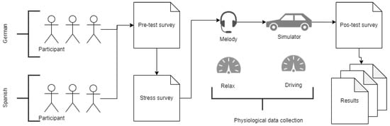 A total of 71 drivers took part in the study, with 38 from Germany and 33 from Spain. The mean age of the participants was 25.84 ± 4.83 years for German drivers and 25.27 ± 3.81 years for Spanish drivers. All participants held valid driving licenses. None of the participants were professional drivers, defined as individuals driving trucks, taxis, buses, or sports cars. The participants were categorized as amateur drivers. All participants were residing in Germany or Spain. They volunteered for the study and did not receive any payment or benefits for their participation. The selection criteria included being in good health, having no history of heart-related diseases that could affect HRV, and possessing normal vision. Additionally, participants were explicitly instructed not to consume drugs, alcohol, or any other beverages or medications before the experiment.